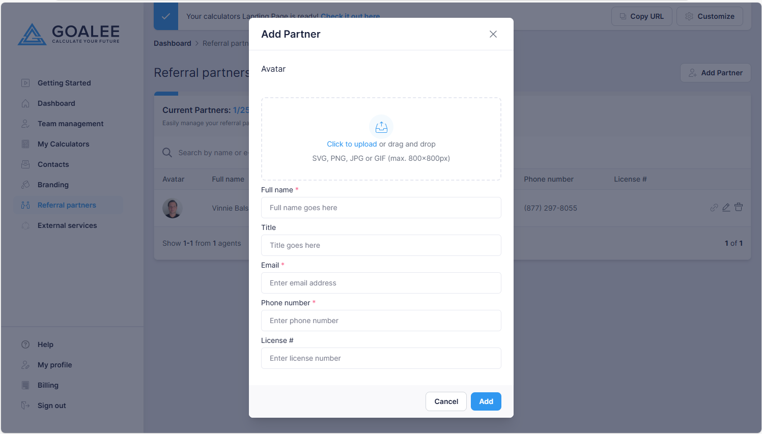 Goalee is pleased to announce an exciting new feature that allows account users to create co-branded partner calculators for marketing on a Goalee page or embedding directly into referral partner websites. This latest enhancement is designed to help businesses amplify their brand presence, generate valuable leads, and cultivate stronger partnerships.